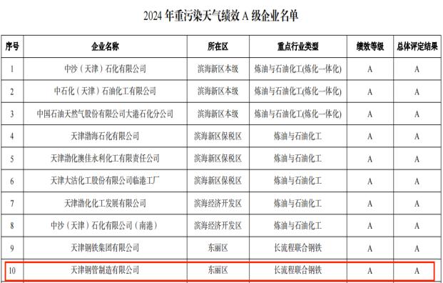 天津钢管以服务京津冀区域协同绿色发展为己任,2024年初,在通过超低排放评估公示的基础上,持续完善有组织与无组织排放治理措施,不断提高超低排放治理水平,并持续更新货运车辆与非道路移动机械,协调采购、销售、物流等多部门,细分品类、逐项攻关,稳步提升大宗物料及产品清洁运输比例至80%以上。2024年9月23日,天津钢管顺利通过天津市生态环境局组织的现场绩效评估;10月17日,天津市生态环境局在官方网站发布绩效评级结果,天津钢管被评定为环保绩效A级企业。天津钢管将通过提高重视程度、完善管控细节、强化管理能力等积极措施,确保环保管理水平持续保持并稳步提升,持续满足环保绩效A级企业相关要求。
