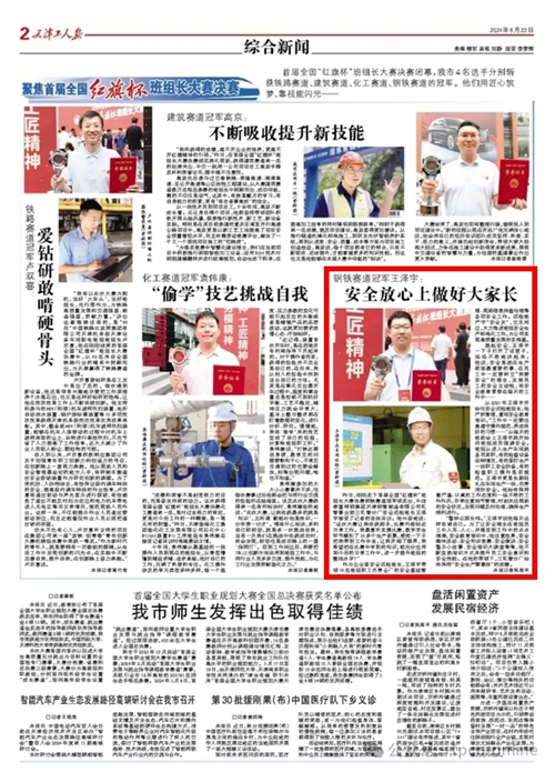 8月22日,《天津工人报》刊发报道《钢铁赛道冠军王泽宇:安全放心上做好大家长》,现全文转发。