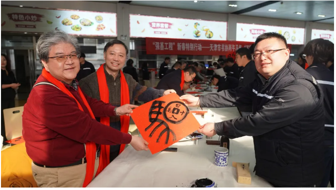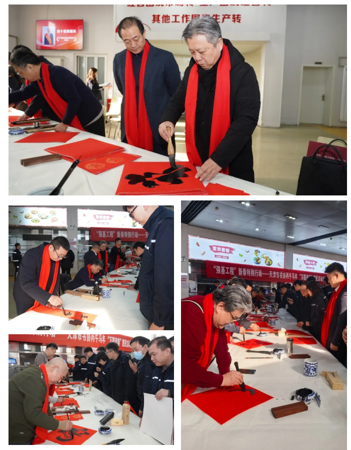 本次活动特别邀请10位书法界重磅名家亲临现场,中国书法家协会理事、天津市文联副主席、天津市书法家协会驻会副主席兼秘书长杨健君,中国书法家协会会员、天津市书协副主席、天津市东丽区书法家协会主席邢纪庆,中国书法家协会会员、天津市书法家协会副主席、西青区书法家协会主席杨国欣,中国书法家协会会员、天津书法家协会副主席、青少年委员会副主任孟巍,中国书法家协会会员、天津市书法家协会理事、天津市红桥区书协副主席王智忠,中国书法家协会会员、全国公安文联会员卢智剑,中国书法家协会会员、天津书协理事、天津书协篆刻委员会副主任赵祥立,中国书法家协会会员、天津市书法家协会理事、天津市和平区书法家协会副主席邓英彪,天津书协草书委员会委员、天津金融书法家协会副主席李延达,天津市书法家协会篆书委员会委员、天津市滨海新区书法家协会理事、副秘书长刘阳为公司劳动模范代表、年度先进代表、女职工代表、青年职工代表以及奋战在各条战线职工挥毫泼墨,写福迎春。