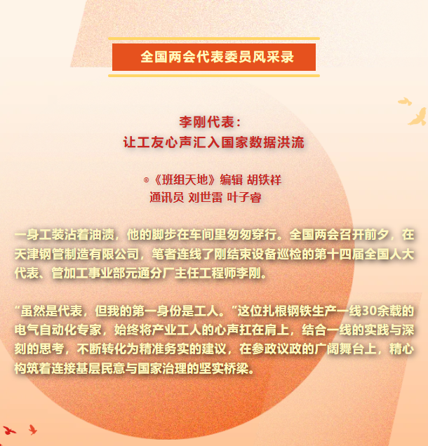 从一名普通产业工人到全国人大代表,李刚始终坚守在生产一线,用脚步丈量车间,用眼睛发现问题,用思考提出建议。“制造业是我国经济命脉所系,是立国之本、强国之基,我们要聚焦制造业数字化转型,全面实施‘人工智能+’行动,这是建设制造业的必由之路。”李刚表示。